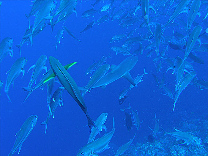 捕食する者と捕食される者の群れがいれば当然、起きることは至ってシンプル。弱い者は食われるという、単純な自然の摂理が支配しているだけだ。このときはメジロザメとロウニンアジが、活発に狩りをしていた。
