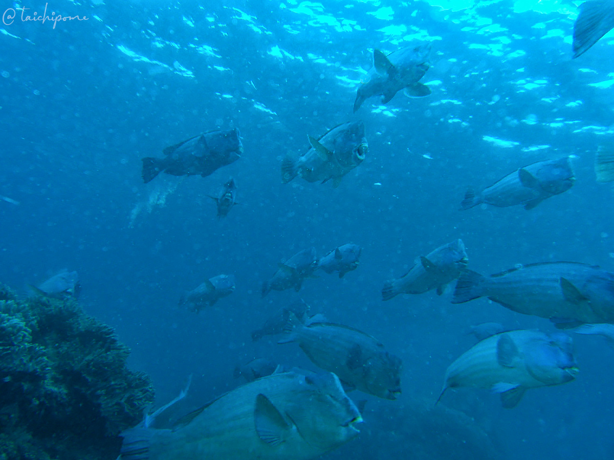 カンムリブダイ、大きな個体は1mを超える。あたりは彼らが珊瑚を囓る乾いた音で満たされる。行進が途切れず、この時は途中で再びドリフト。